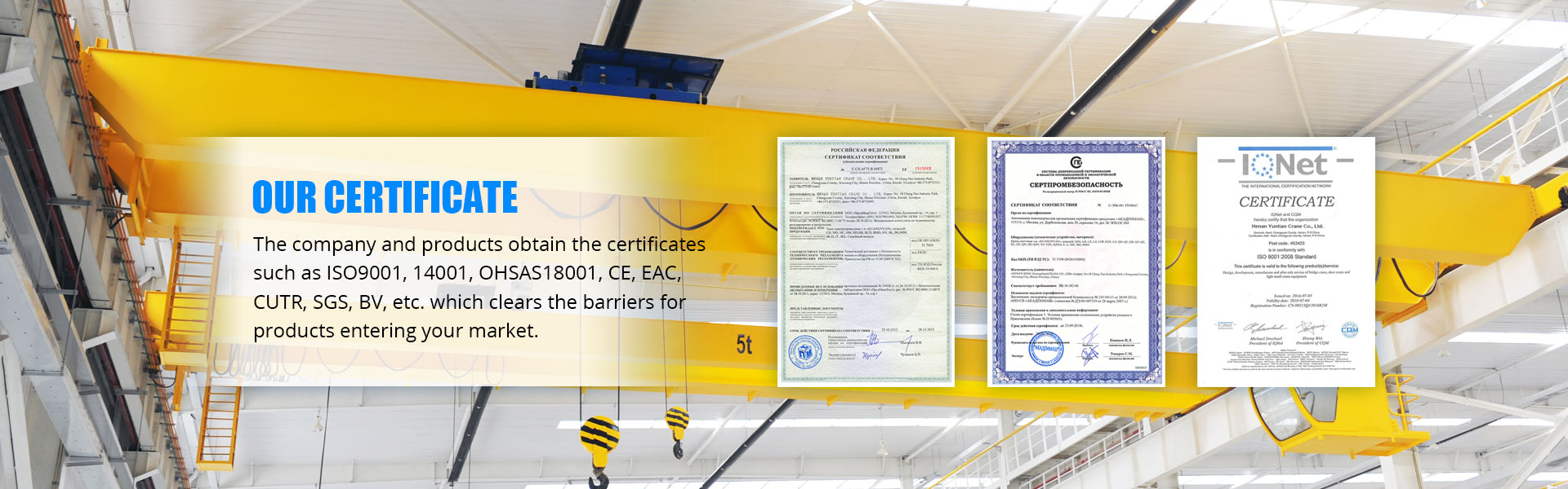 Kami boleh membekalkan anda semua jenis kren industri dari 0.25tons ke 900tons, lulus GB / T 19001-2000 IDT ISO 9001: 2000, GB / T 24001-2004 idt ISO 14001: 2004, GB / T 28001-2001, OHSAS 18001: 1999, CE, GOST, SGS, TUV, BV dan sebagainya.